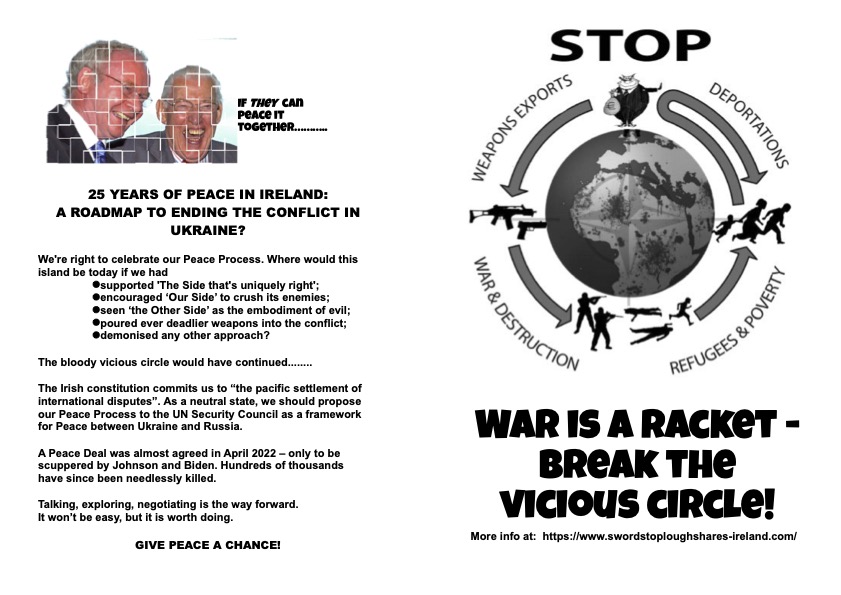 StoP is a network of peace groups and peace activists throughout the island of Ireland who are deeply concerned about the developing arms industry in the Republic, supported by the Irish government, the growing and sizeable arms industry in Northern Ireland, the increasing militarisation of the EU, and the recent heightening of tensions between Russia and NATO.