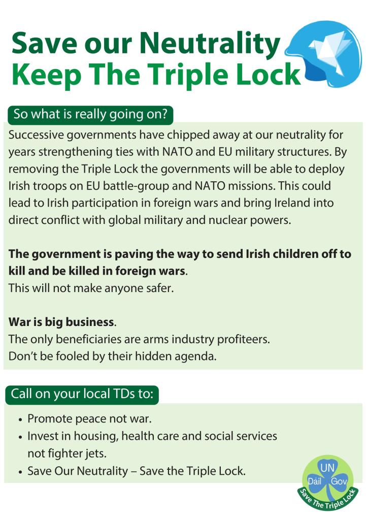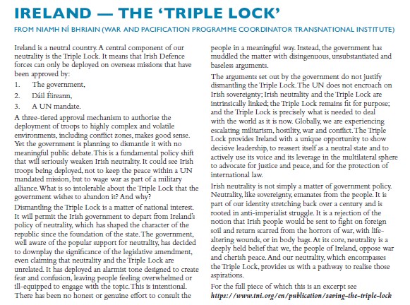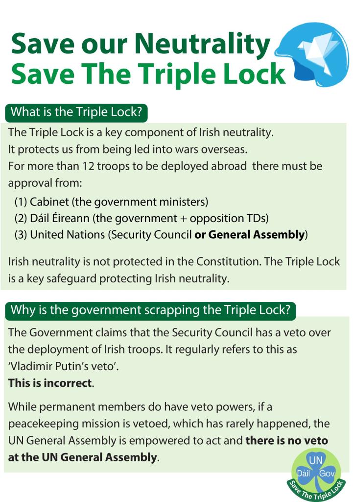 An excellent recent detailed article on the Triple Lock by Niamh Ní Bhriain is available at https://www.tni.org/en/publication/saving-the-triple-lock and this carefully demolishes government arguments for abandoning it.