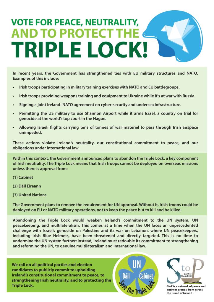 Two print-it-yourself mini-posters (A4 size) from INNATE on the Triple Lock are available at https://innatenonviolence.org/wp/wp-content/uploads/2023/12/Triple-Lock-Neutrality-2.pdf and https://innatenonviolence.org/wp/wp-content/uploads/2023/12/Warlock.pdf